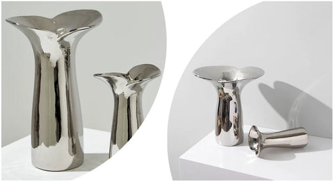 Inspired by the very moment a flower bud opens to reveal its petals, this modern ceramic vase features a silver glossy finish and smooth flowing curves. Handcrafted by skilled artisans with every detail fine-tune to perfection, Bloom Vase adds a sophisticated touch to any home decor or bring a modern charm to your table setting.